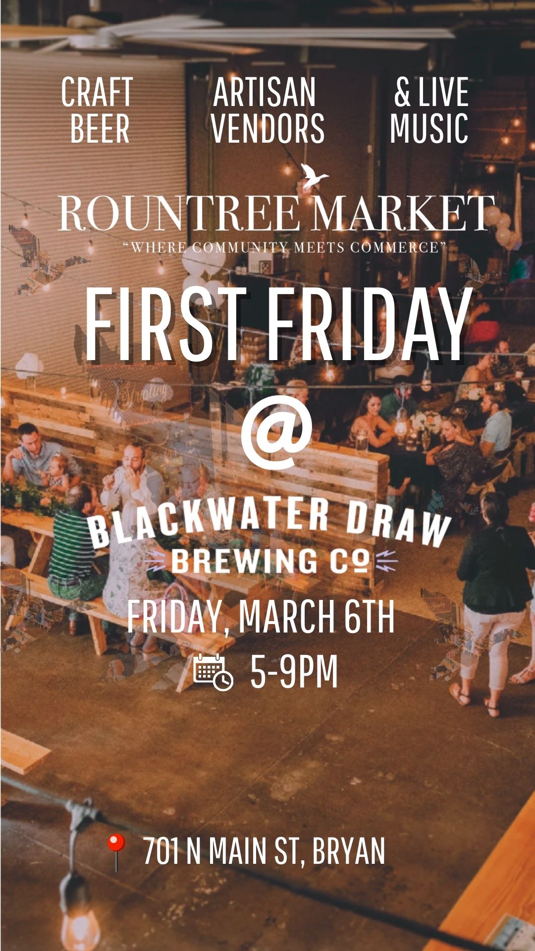 Be part of one of Downtown Bryan’s busiest nights! Rountree Market is hosting a curated First Friday pop-up in front of Blackwater Draw Brewing Co., located further down from the main First Friday stretch, capturing foot traffic flowing through the district while offering a relaxed, high-energy atmosphere. 🗓 Friday, March 6th ⏰ 5:00 PM – 9:00 PM 📍 701 N Main St, Bryan, TX 💲 Vendor Fee: $35 This is an intentionally limited market — only 8 vendor spots available. We keep it small to ensure strong visibility, better customer engagement, and higher sales opportunities for each vendor. Vendors must provide a 10x10 tent with weights and lighting. **no food vendors