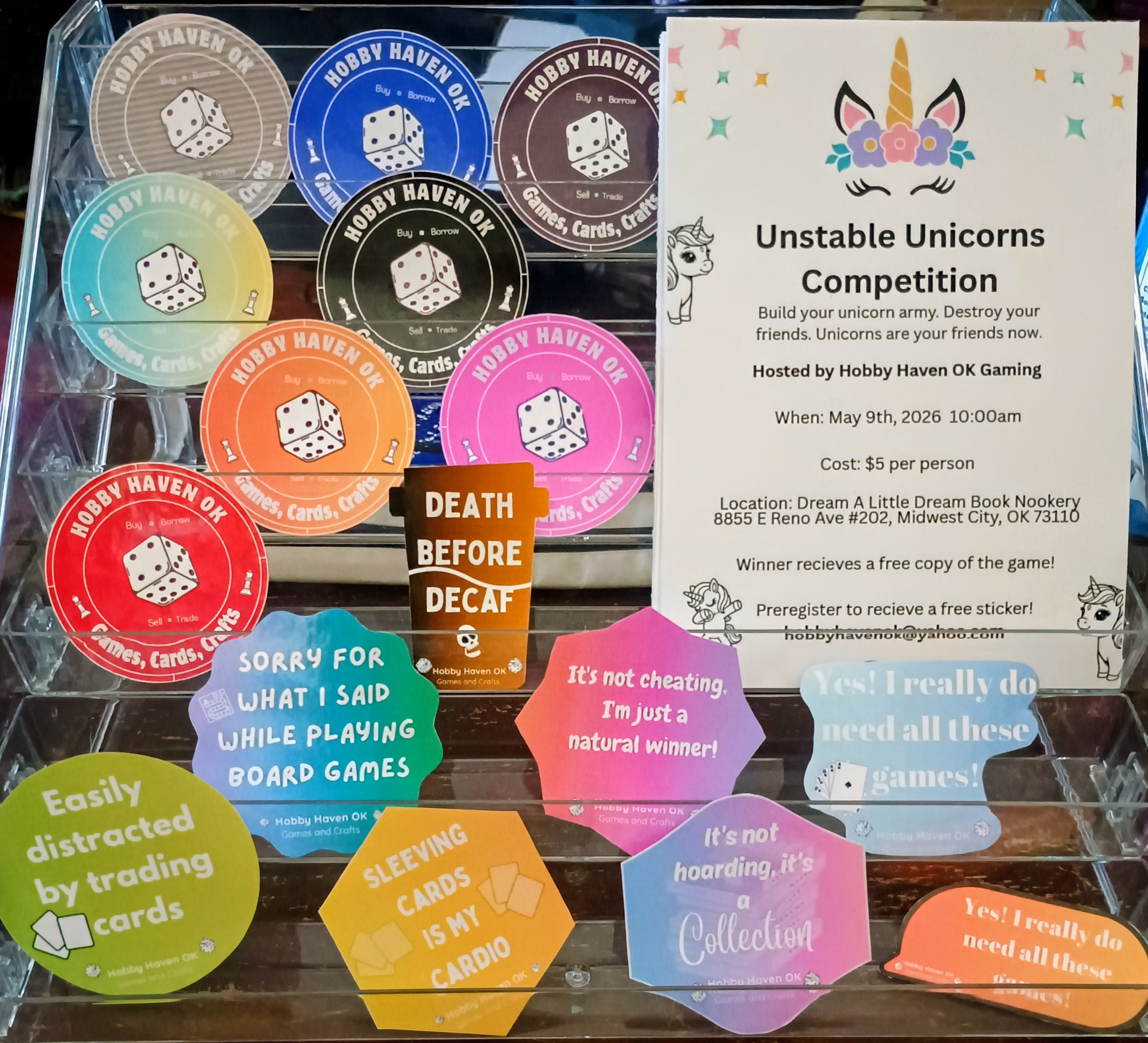 We sell a selection of new and used board games and offer a great line of original hand crafted game themed items such as dominos, dice, dice bags, dungeon soap, candles, coasters, minifigures, and more